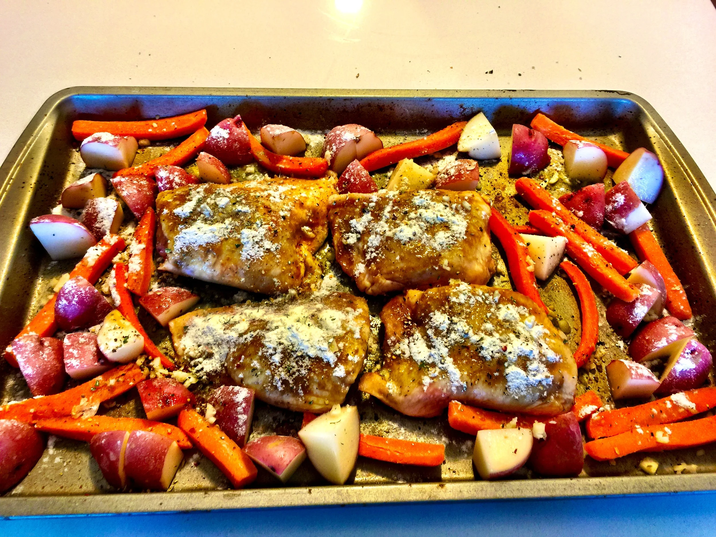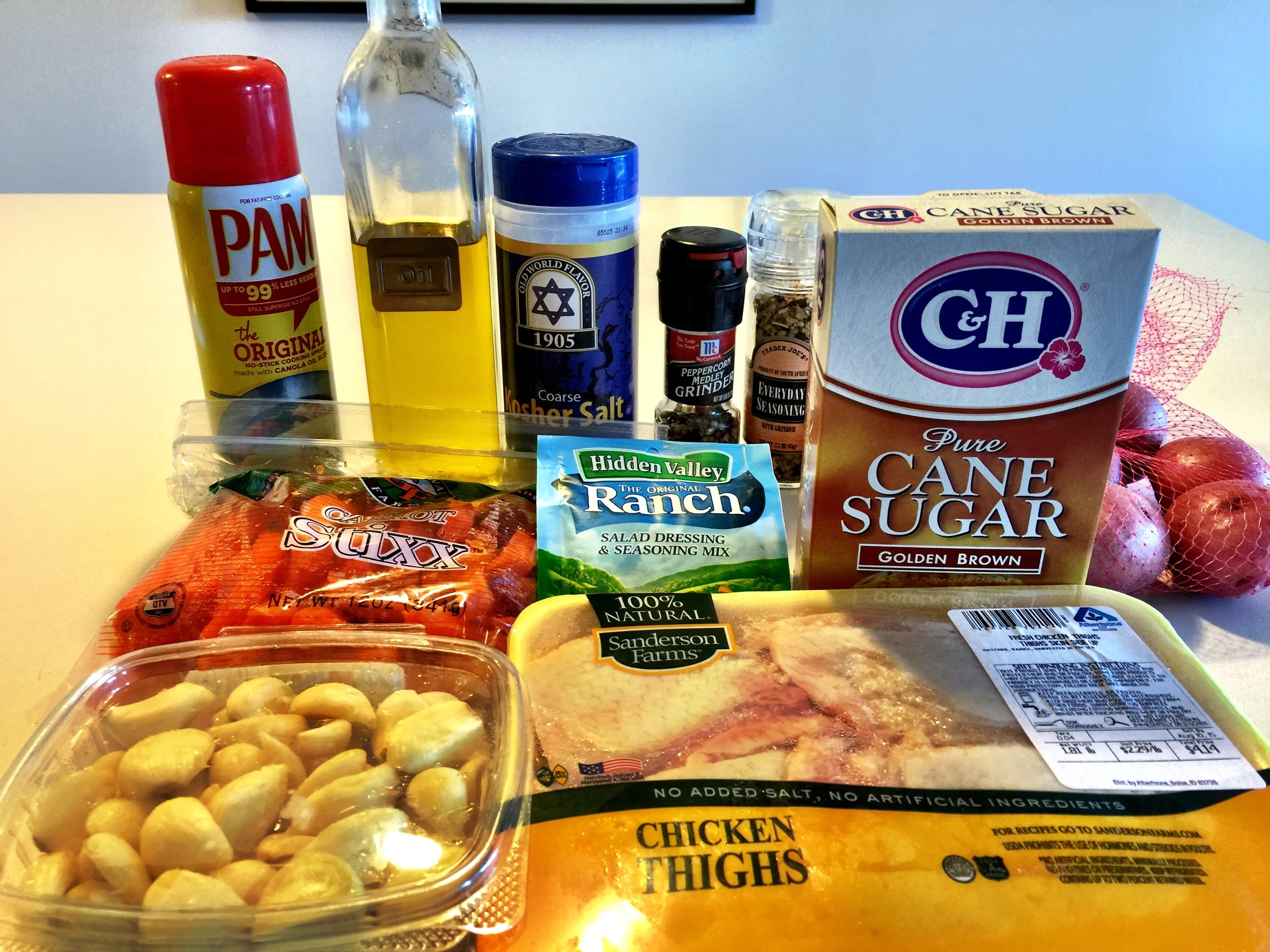 The recipe is as basic as they come. Chop up a couple cloves of garlic. Slice up the red potatoes. Throw the potatoes, carrots (we bought these pre-cut) on a pan that has some sort of cooking spray on it. Then take your bone-in skin on chicken thighs and spread brown sugar on both the top and bottom of them. Put those in the pan. Then sprinkle on olive oil, the ranch packet, salt and pepper and your chopped up garlic. Throw the pan in the oven at 400 degrees for a half hour (we did 40 minutes) and then broil it for around five minutes.