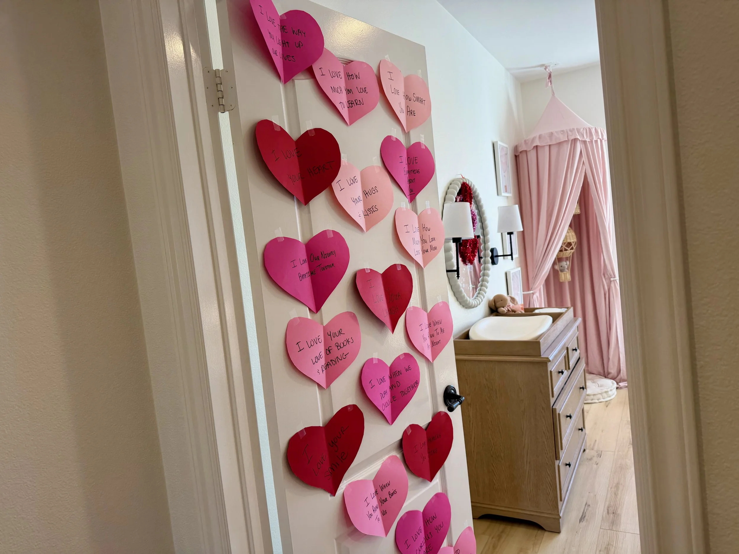 It was quite a change coming back home from temperatures in the teens to the seventies. Jenn set up a great Valentine's arts-and-crafts activity where we cut out hearts for Elle and wrote what we loved about her on them, then taped them to her door. Every day for the two weeks between when we made them and Valentine’s Day, Elle would say “hearts” as we walked by them.