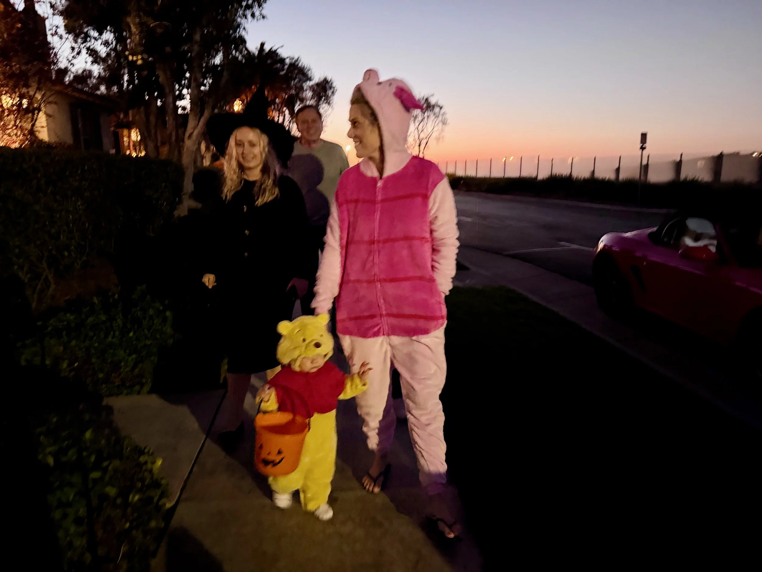 And then, came Halloween. It comes as no surprise that I bought Halloween costumes for the whole family – Winnie the Pooh themed. Elle was Winnie the Pooh, Frasier was Tigger, I was Piglet, and Joel was of course, Eeyore. I had dreamed for so long of taking our child trick-or-treating in a neighborhood. That dream… didn’t quite go as planned. We invited Dad and Joan and Holly to come with us. For about a week prior, we were practicing with Elle, with her little pumpkin bowl, saying “trick-or-treat.” So, when Halloween came, we were ready. Well, on that night, we headed out from the house around 5:00 or 5:30, knowing we’d only have about an hour before bedtime. As we walked out the door, excited, we found the neighborhood to be completely dead. No lights. No kids. Nothing. We walked up and down the street, costumes on, hopeful, and feeling a bit ridiculous. Finally, after a good 10 minutes, we spotted one house with a light on and a bowl of candy outside their door. We ran to it. Elle said “trick-or-treat” to the door, we handed her some candy, and that was it. It was disappointing, honestly, but we made the best of it. We all walked back home, ordered pizza, opened wine, laughed, and enjoyed being together.