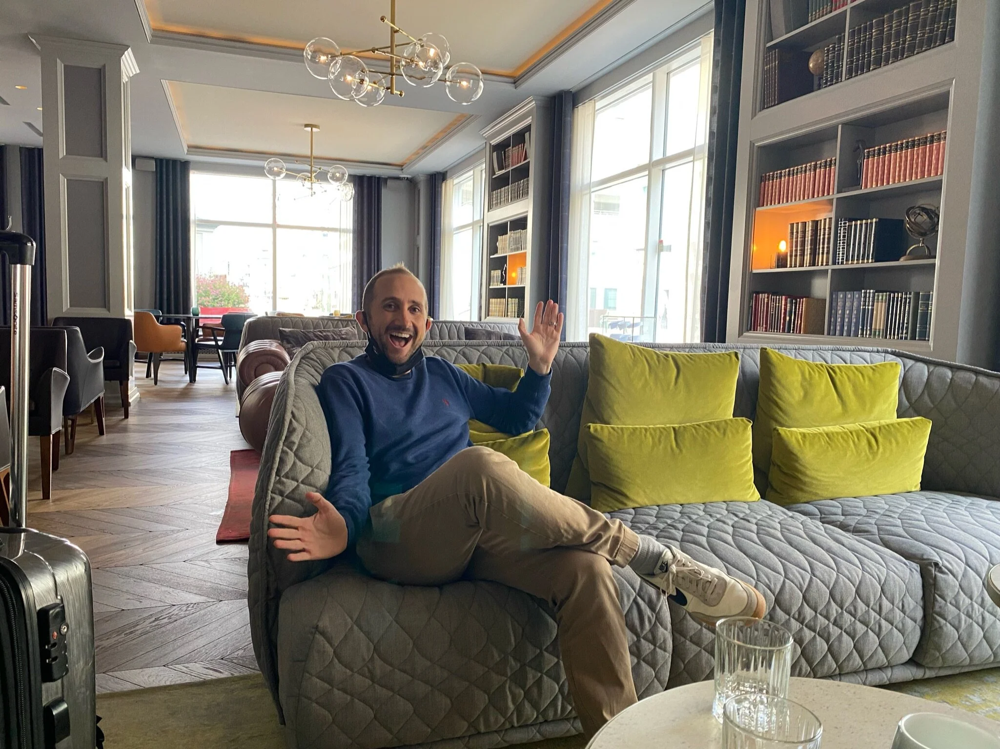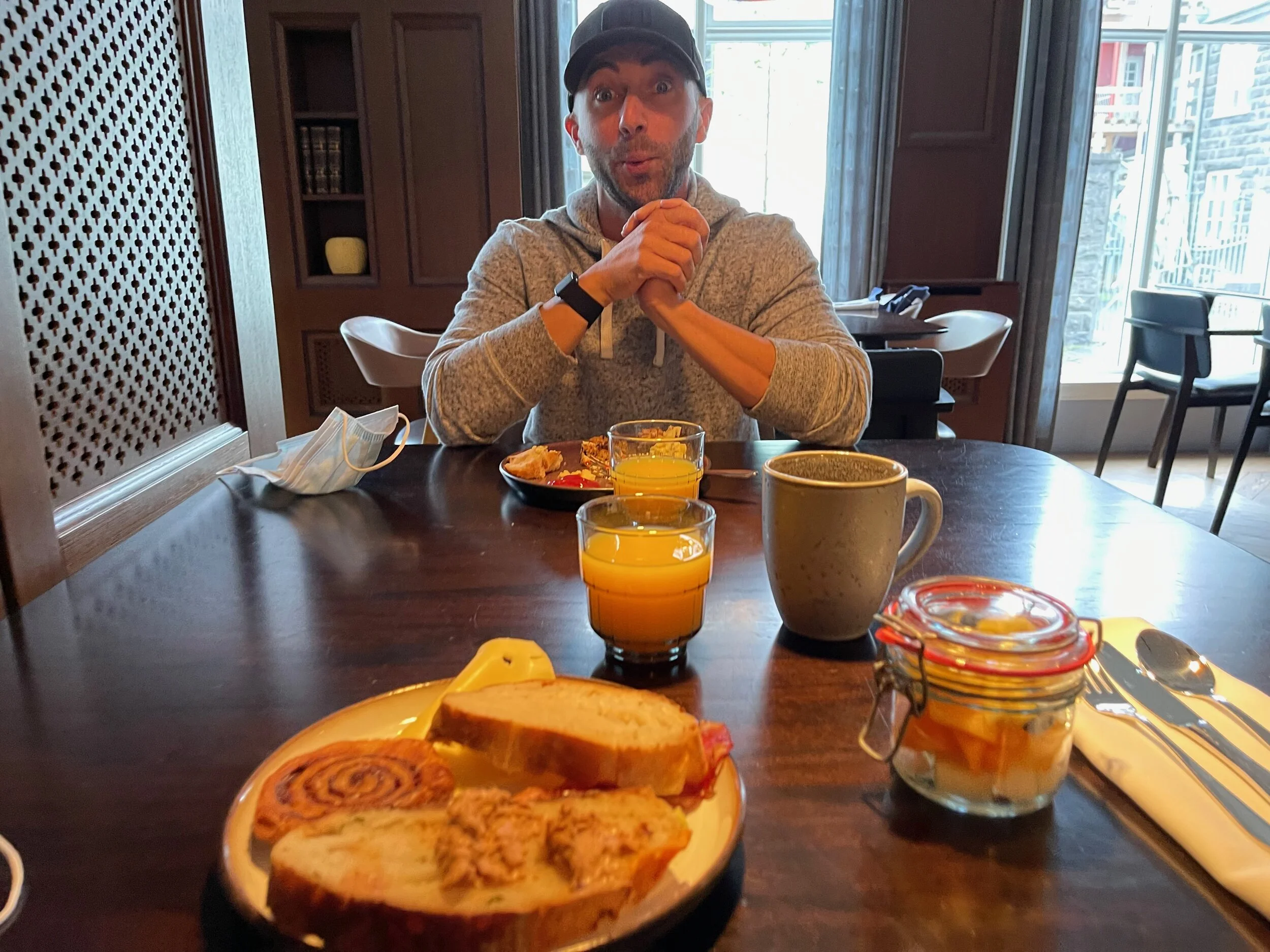 The good news is that drivers are on the same side of the road as the United States so outside of a lot of roundabouts and weird-sounding street names Jake was able to navigate us to our hotel with relative ease. Our hotel, unfortunately, did not have its own parking area so we were forced to find street parking. Luckily we did after some searching and were able to check-in to our hotel at 10 AM. We recorded a room tour (doing our best Jenn impression) and unpacked our luggage. The room was beautiful, well-appointed, with a nice street view.