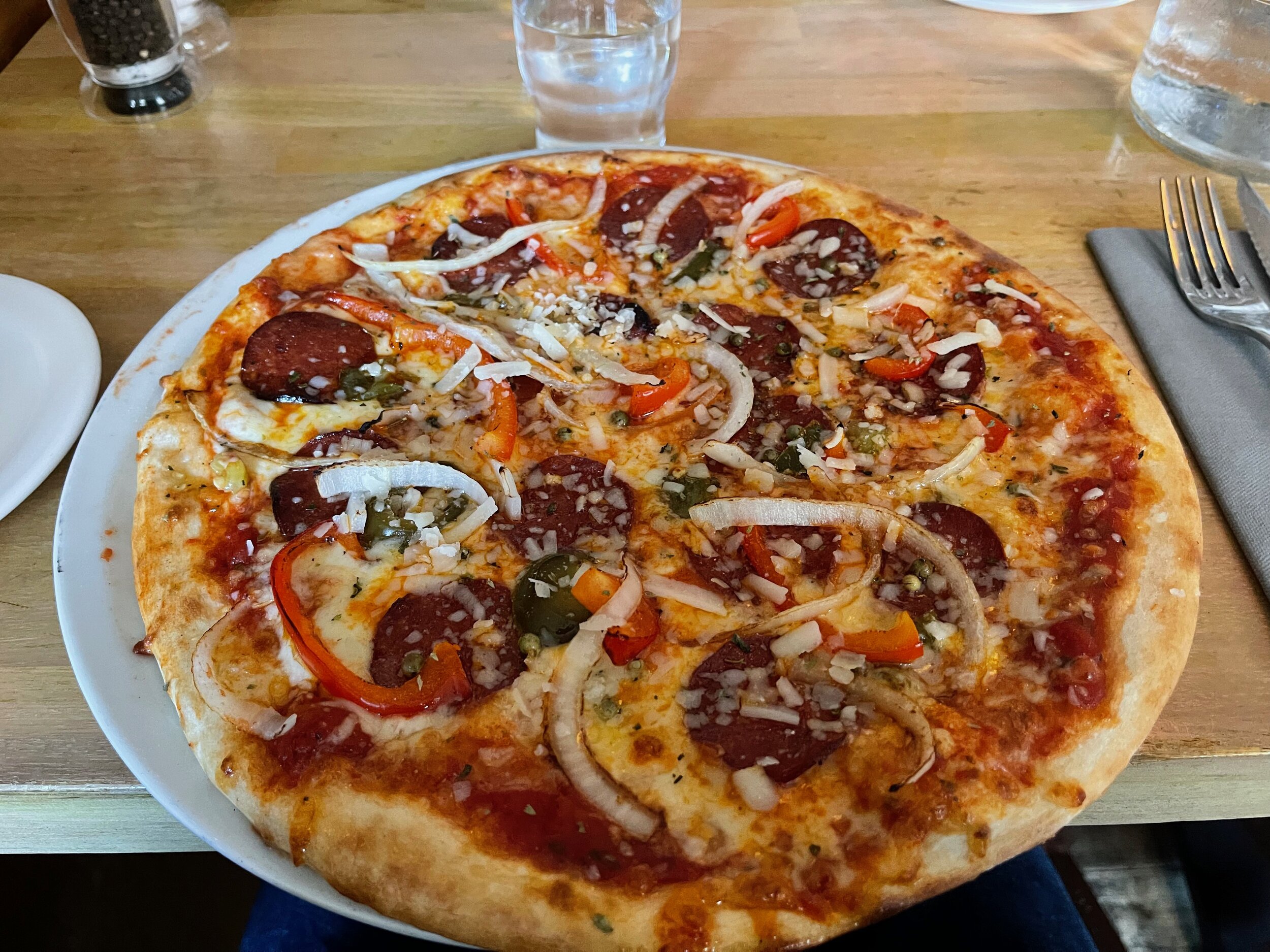 We arrived at our tour a few minutes before 5 PM and left to make our way to the first of seven stops. Unfortunately right when we arrived at the restaurant Jake was starting to not feel well and by the end of the first stop, I could tell by the look on his face that he wasn’t going to make it for the tour. I let the tour guide know we might try to catch up with them but knew that probably wasn’t going to happen. We went back to our hotel and let Jake try to recuperate while I enjoyed the free hotel happy hour drinks and snacks. When Jake was feeling up to it we walked to a nearby pharmacy for some stomach medicine and within an hour he was feeling much better. So much so that we did some google searching and found a nearby Italian restaurant to have dinner at called Ristorante Caruso. After a short wait, we got our table and ordered two pizza’s and called it a night. Although not the smoothest start to the trip we knew the best was still in front of us.